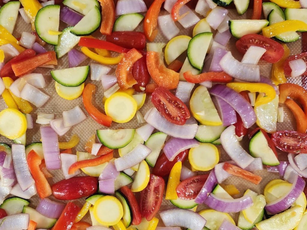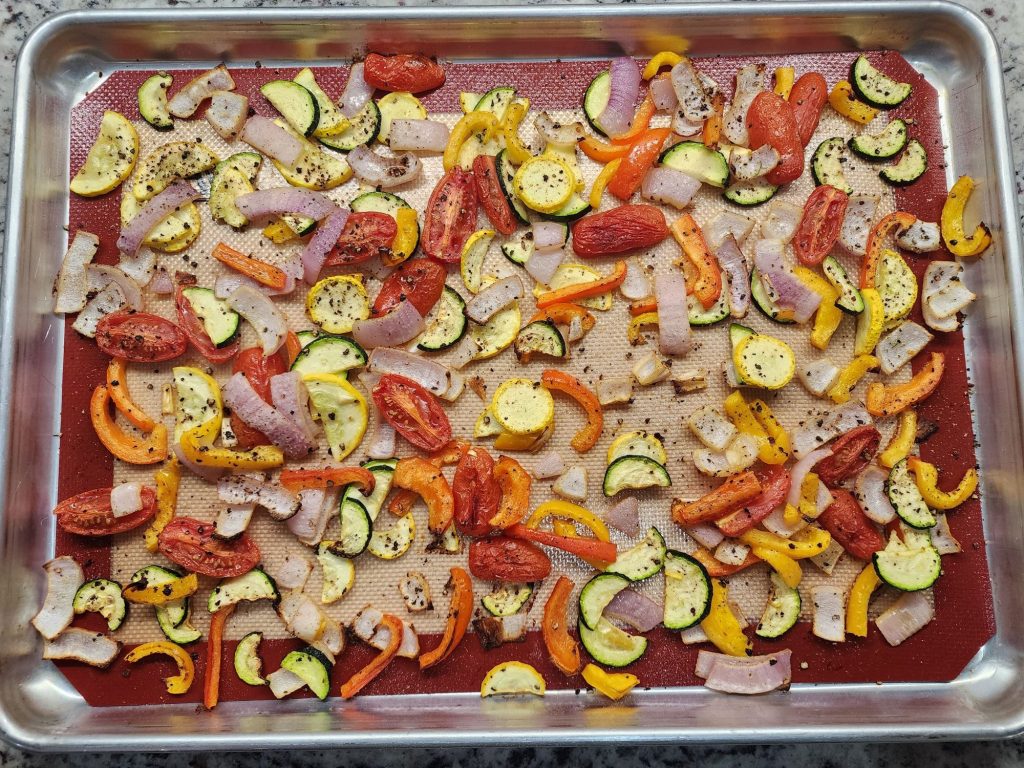 - Put lightly oiled veggies on baking sheet lined with a silicone pad or parchment paper.