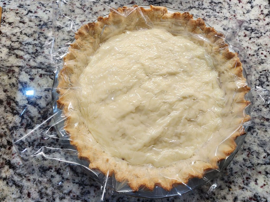 - Immediately pour filling into pastry shell. Cover filling with plastic wrap (see photo).
